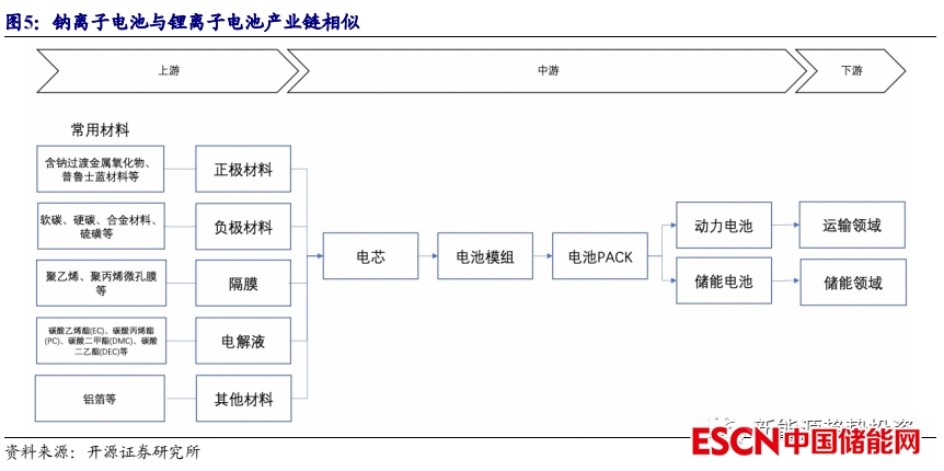 鈉離子電池具備產(chǎn)業(yè)化快速提升的潛力。鈉離子電池與鋰離子電池的生產(chǎn)線、制作工序相似,英國FARADION 公司的鈉離子電池甚至能在現(xiàn)有的鋰離子電池生產(chǎn)線上生產(chǎn)。隨著鋰電和上游材料企業(yè)入局,產(chǎn)業(yè)化進(jìn)程會大幅提速。我們相信在未來3~5年,鈉離子電池產(chǎn)業(yè)鏈會基本形成,鈉離子電池相關(guān)工藝、相應(yīng)的電池管理系統(tǒng)、相關(guān)技術(shù)體系如電芯設(shè)計(jì)、極片制作、電解液和隔膜選型也會趨于成熟。