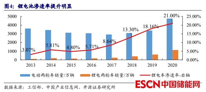 電動車市場上,鉛酸電池被替代已成趨勢。新版《電動自行車安全技術(shù)規(guī)范》自2019年4月15日正式實(shí)施,規(guī)定電動自行車整車質(zhì)量不得超過55kg,超標(biāo)車型或換用質(zhì)量更輕的鋰電池(中低端鋰電池能量密度約為鉛酸電池的4倍),或申請電動摩托車目錄成為機(jī)動車(消費(fèi)者需要相關(guān)駕照,并且額外增加上牌費(fèi)、年檢費(fèi)、保險(xiǎn)費(fèi)等額外費(fèi)用),或退出電動車市場。目前鋰電池滲透率不斷提高,鉛酸電池將被快速取代。