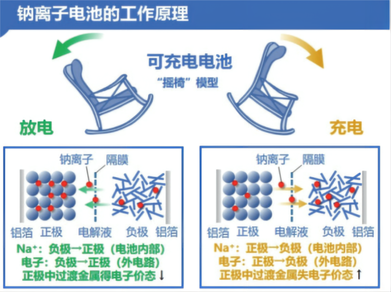 從工作原理上來說,鈉離子電池與鋰離子電池一樣,都是“搖椅式電池”。鈉離子電池在充電時,鈉離子從正極脫出,經(jīng)電解液橫穿隔膜嵌入負極,使正極處于高電勢的貧鈉態(tài),負極處于低電勢的富鈉態(tài);放電過程則與之相反,鈉離子從負極脫出,經(jīng)電解液穿過隔膜嵌入正極材料中,使正極恢復到富鈉態(tài)。