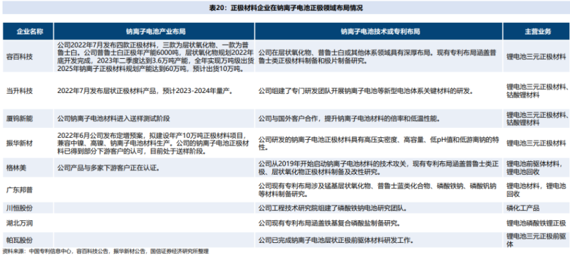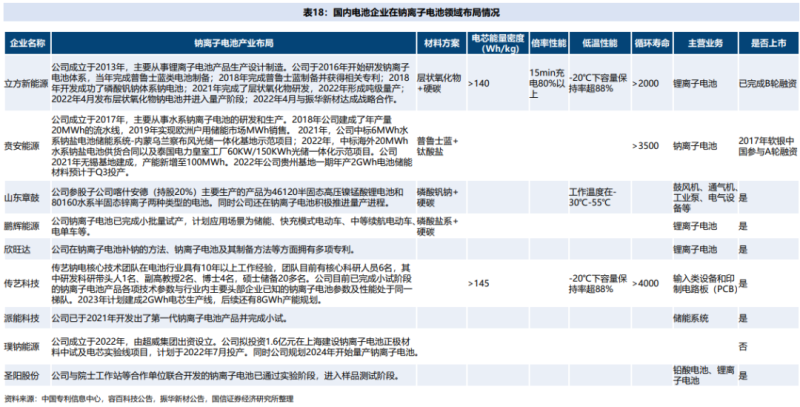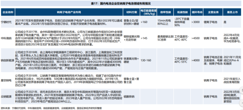 國(guó)內(nèi)企業(yè)里,中科海鈉、立方新能源等企業(yè)均已實(shí)現(xiàn)量產(chǎn),寧德時(shí)代等企業(yè)也在積極推進(jìn)鈉離子電池產(chǎn)業(yè)化,蜂巢能源、億緯鋰能、國(guó)軒高科、欣旺達(dá)、派能科技等傳統(tǒng)鋰離子電池企業(yè)也已具備相關(guān)技術(shù)布局。