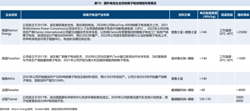 國(guó)外企業(yè)中,英國(guó)Faradion起步早、積淀深,美國(guó)Natron Energy、瑞典Altris等也在加速推進(jìn)量產(chǎn)進(jìn)程。