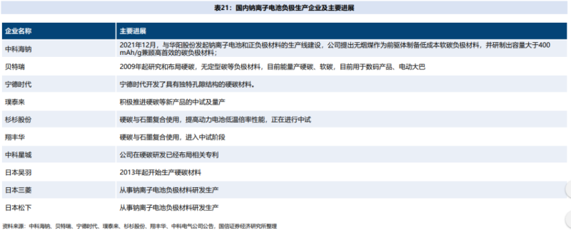 負(fù)極材料布局方面,中科海鈉以無(wú)煙煤作為前驅(qū)體制備軟碳材料,寧德時(shí)代開(kāi)發(fā)出了具有獨(dú)特孔隙結(jié)構(gòu)的硬碳材料,貝特瑞目前能量產(chǎn)硬碳、軟碳材料;璞泰來(lái)、 翔豐華目前正在推進(jìn)中試工作。