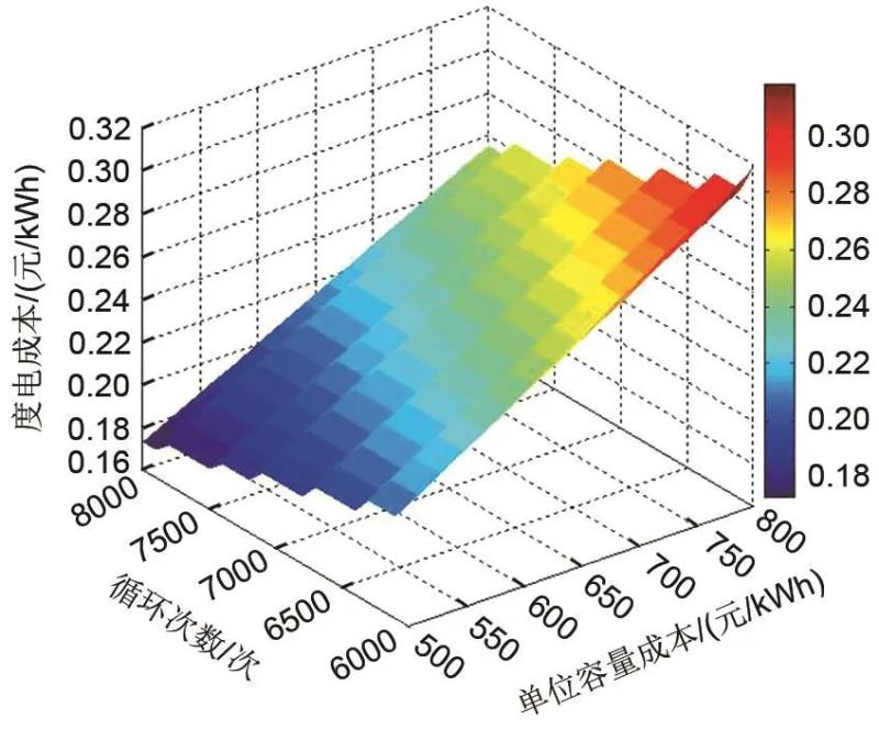 圖4 單位容量成本和循環(huán)次數(shù)對儲能度電成本的影響