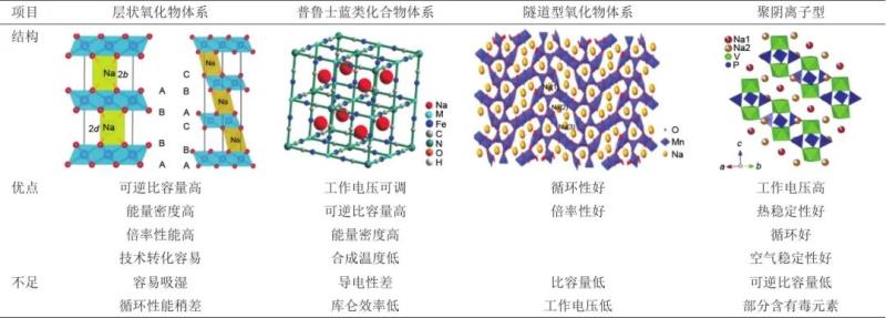 與鋰離子電池類似,按正極材料分,鈉離子電池主要有層狀氧化物、隧道型氧化物、普魯士藍(lán)類化合物和聚陰離子型化合物體系,各體系特點見表1。