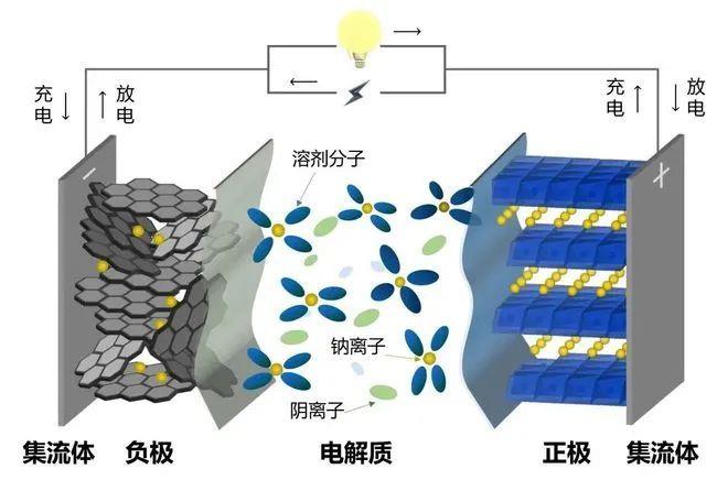 和鋰離子電池一樣,鈉離子電池的主要結(jié)構(gòu)也包括正極、負極、電解質(zhì)、隔膜、集流體等,只是電池內(nèi)傳導的不再是鋰離子,而是鈉離子。正負極被電解質(zhì)浸潤以保證離子導通,隔膜用以將正負極隔開防止內(nèi)短路,集流體則起收集和傳導電子的作用。