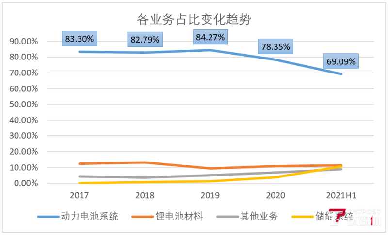 作為拉動(dòng)營收增長主要的動(dòng)力電池系統(tǒng)業(yè)務(wù)部分,雖然2021年上半年收入有較大幅度增長,但其對(duì)營收的貢獻(xiàn)比例下降至69.09%, 鋰電材料與儲(chǔ)能系統(tǒng)對(duì)營收貢獻(xiàn)率均超過10%。
