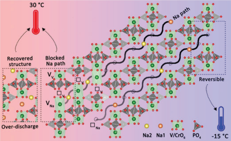 過渡金屬離子的氧化-還原過程及其結(jié)構(gòu)穩(wěn)定性在可充堿金屬離子電池的電極材料中起到關(guān)鍵的作用。在兩類主要的電池正極材料(聚陰離子型材料和層狀氧化物材料)中,過渡金屬離子均起到構(gòu)建材料結(jié)構(gòu)框架、提供反應(yīng)電子的作用,其在框架中的結(jié)構(gòu)穩(wěn)定性亦對(duì)材料循環(huán)性能、容量、電壓、安全性的起著決定性的影響。過渡金屬離子在層狀氧化物材料晶格中的遷移問題已經(jīng)引起了足夠的重視。例如鋰離子電池三元材料中普遍存在的Li/Ni混排導(dǎo)致層狀向尖晶石或巖鹽相的轉(zhuǎn)換會(huì)阻塞Li離子的擴(kuò)散;Mn離子的遷移則會(huì)在長循環(huán)后導(dǎo)致正極框架結(jié)構(gòu)的破壞;在鈉離子電池層狀氧化物材料O3型NaFeO2中也觀察到了過渡金屬離子遷移的現(xiàn)象。與之相反,聚陰離子型材料則通常被認(rèn)為具有穩(wěn)定的框架可以阻礙過渡金屬離子在框架結(jié)構(gòu)中的遷移。楊勇教授課題組此前發(fā)現(xiàn)Na3VCr(PO4)3(NVCP)在低溫下表現(xiàn)出比常溫更優(yōu)異的V3+/V4+/V5+多電子反應(yīng)可逆性及循環(huán)穩(wěn)定性。而目前所報(bào)道的電池正極材料均表現(xiàn)出常溫比低溫性能優(yōu)異的現(xiàn)象,因而NVCP的表現(xiàn)較為反常。