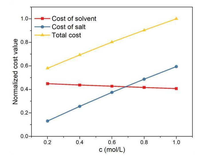 圖2:預(yù)估的不同鹽濃度下電解液成本(假設(shè)鹽是溶劑價(jià)格的11倍,按最高值歸一化)