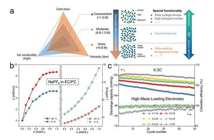 電解液是儲(chǔ)能電池不可或缺的重要組成部分,而調(diào)控電解液濃度是實(shí)現(xiàn)其功能化設(shè)計(jì)的有效策略之一。近年來(lái),高鹽濃度電解液因其特殊的體相與界面特性被廣泛用于金屬鋰電池、水系電池等(本課題組曾于2013年首次提出“Solvent-in-Salt”電解液用于金屬鋰電池,Nature Communications2013, 4, 1481,引用1224次)。但與此相反,降低鹽濃度可能會(huì)帶來(lái)濃差極化,所以目前實(shí)際鋰電池應(yīng)用大多集中于標(biāo)準(zhǔn)的1 M濃度,從而使得低鹽濃度電解液一直沒(méi)有得到系統(tǒng)的研究。鈉離子的Stokes半徑和脫溶劑化能均比鋰離子的要低,因此理論上采用較低的鈉鹽濃度也可實(shí)現(xiàn)足夠的動(dòng)力學(xué)性能,從而使得超低鹽濃度電解液應(yīng)用于鈉離子電池成為可能。考慮到鹽的成本通常是溶劑的十倍以上,減少鈉鹽使用可以有效降低鈉離子電池的成本,從而有利于鈉離子電池在儲(chǔ)能領(lǐng)域的大規(guī)模應(yīng)用。