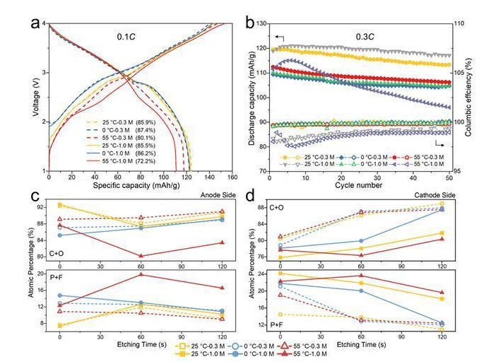 圖4:(a和b)使用0.3 M和1 M電解液在0°C,25°C和55°C下電池的電化學(xué)性能。(a)0.1 C首周充放電曲線。相關(guān)的首周庫(kù)侖效率在括號(hào)中注明。(b)0.3C的循環(huán)穩(wěn)定性。(c和d)帶有Ar+蝕刻的XPS測(cè)試分析電池以0.1C倍率循環(huán)一圈后電極表面鈍化化學(xué)。在(c)負(fù)極界面膜和(d)正極界面膜上檢測(cè)到的C(C 1s)+ O(O 1s)和P(P 2p)+ F(F 1s)元素的原子比。