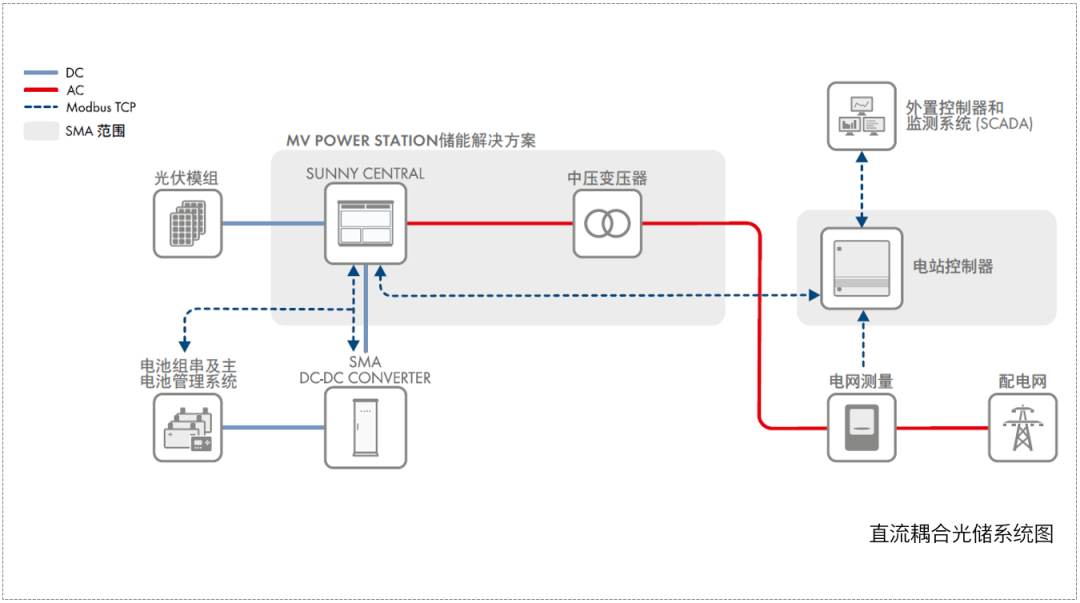 不同于光伏系統(tǒng)、儲能系統(tǒng)彼此獨立運行的AC-Coupling交流耦合方案,SMA DC Coupling直流耦合方案,將儲能電池和太陽能電池板連接在集中式光伏逆變器直流側(cè),光伏逆變器再與中壓變壓器相連,構(gòu)成完整的直流耦合光儲系統(tǒng)。
