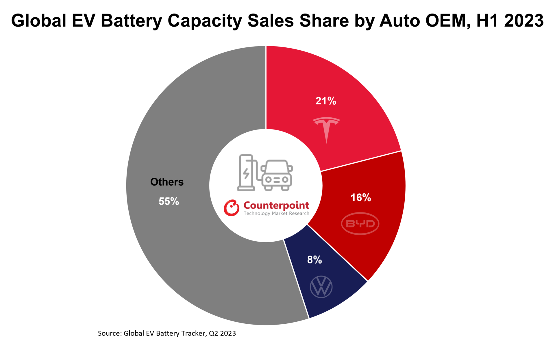 2023年上半年,特斯拉、比亞迪和大眾汽車占電動汽車電池總銷量的近45%。特斯拉Model 3和Model Y的銷量激增,對寧德時代和LG能源解決方案的增長起到了關(guān)鍵作用。特斯拉上海工廠生產(chǎn)的Model 3和Model Y的標(biāo)準(zhǔn)版電池由寧德時代提供,Model 3和Model Y的性能版電池由LG能源解決方案提供。現(xiàn)代、起亞、福特的電動汽車為SK Innovation的市場占有率起到了積極的作用,而Rivian和寶馬則主要依靠三星SDI作為電池供應(yīng)商。在北美地區(qū),松下作為特斯拉車型的主要電池供應(yīng)商,占據(jù)著關(guān)鍵地位。