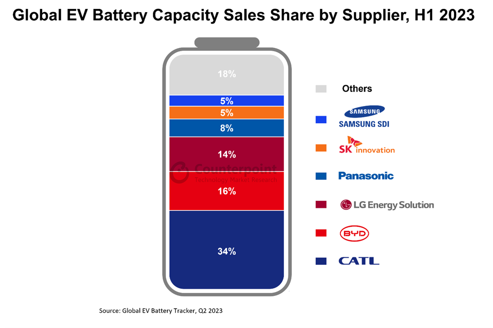中國儲能網(wǎng)訊:根據(jù)Counterpoint對全球電動汽車電池的最新研究,2023年上半年全球電動汽車電池銷量同比增長54%,達(dá)到300GWh以上。在此期間,全球電動汽車銷量也經(jīng)歷了43%的同比增長。寧德時代引領(lǐng)電動汽車電池市場,比亞迪和LG能源解決方案緊隨其后。2023年上半年,這三大公司合計(jì)占近2/3的市場份額。在電動汽車電池安裝方面,領(lǐng)先的地區(qū)是中國、美國和歐洲。