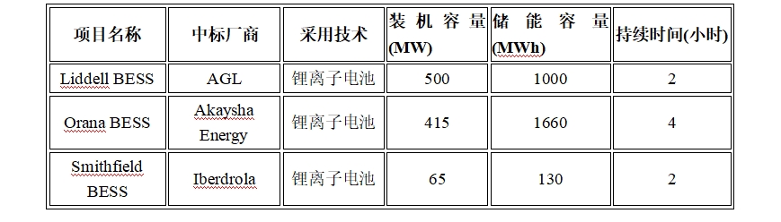 這一輪中標(biāo)的項目并沒有長時儲能系統(tǒng)(LDES)。與其相反,在三個中標(biāo)的電池儲能項目中,有兩個是持續(xù)時間為2小時的電池儲能系統(tǒng),另一個是4小時的電池儲能系統(tǒng)。這三個電池儲能項目的總裝機容量為980MW,儲能容量2790MWh。中標(biāo)者名單如下表所示: