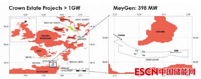 自 2009 年開始,英國開始著手推動(dòng)規(guī)?;某绷髂馨l(fā)電利用,以 SIMEC Atlantis Energy 公司為主要運(yùn)營方,啟動(dòng)名為“梅根”(Meygen)的潮流能發(fā)電廠建設(shè)項(xiàng)目。Meygen項(xiàng)目位于蘇格蘭北部的彭特蘭水道,總裝機(jī)規(guī)模 398 MW,分多個(gè)階段實(shí)施。