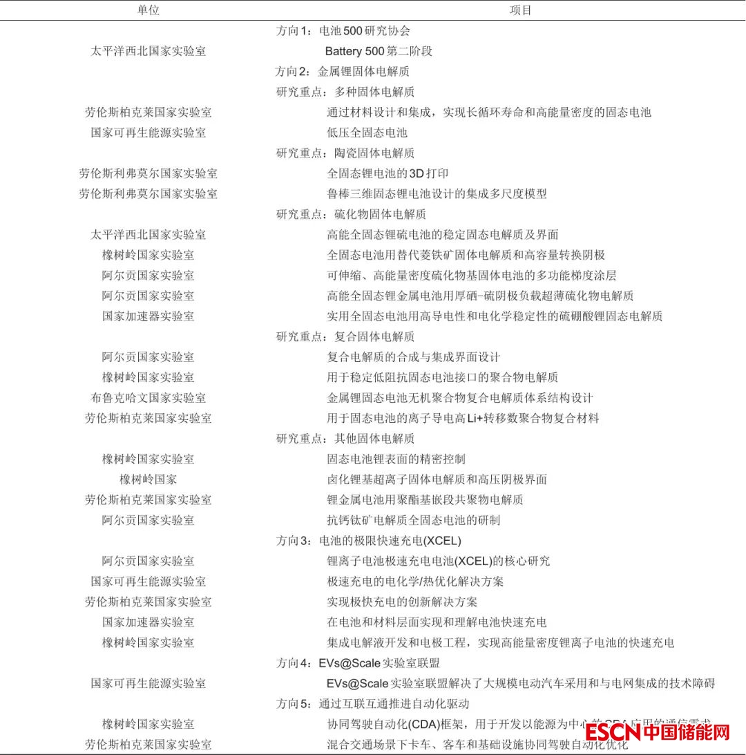 能源部認(rèn)為先進(jìn)的鋰電池在21世紀(jì)的技術(shù)中起著不可或缺的作用,如電動汽車、固定電網(wǎng)存儲在國防中的應(yīng)用,這些技術(shù)對確保美國清潔能源的未來至關(guān)重要。2021年10月美國能源部計劃提供2.09億美元資金,宣布支持阿貢國家實驗室等開展全固態(tài)電池、電池快充技術(shù)等領(lǐng)域26個項目研發(fā)。此次研究項目的關(guān)鍵目標(biāo)是顯著降低下一代電池技術(shù)的成本和尺寸,推進(jìn)電池在15分鐘內(nèi)極速充電,以減輕全國范圍內(nèi)充電的數(shù)千萬輛汽車對電網(wǎng)的潛在影響等。研究項目包括電池500第二階段、通過材料設(shè)計和集成實現(xiàn)長循環(huán)壽命和高能量密度的固態(tài)電池、低壓全固態(tài)電池、全固態(tài)鋰電池的3D打印、高能全固態(tài)鋰硫電池的穩(wěn)定固態(tài)電解質(zhì)及界面、鋰離子電池極速充電電池等,其中重點研究固態(tài)電解質(zhì)技術(shù)包括多種固體電解質(zhì)、陶瓷固體電解質(zhì)、復(fù)合固體電解質(zhì)等,承擔(dān)項目牽頭單位包括8家國家實驗室,其中橡樹嶺國家實驗室6項,勞倫斯柏克萊國家實驗室和阿爾貢國家實驗室各5項,國家可再生能源實驗室3項,勞倫斯利弗莫爾國家實驗室、太平洋西北國家實驗室和國家加速器實驗室各2項,布魯克哈文國家實驗室1項,具體研究項目如表1所示。