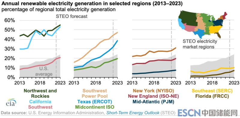 在過去十年中,美國西南電力市場(SPP)地區(qū)的可再生能源發(fā)電份額增長最大,這主要是得益于當(dāng)?shù)氐娘L(fēng)力發(fā)電。2013年,該地區(qū)13%的發(fā)電來自可再生能源。該份額在2021年增加到40%,預(yù)計(jì)2022年將上升到44%。德克薩斯州電力可靠性委員會(ERCOT)負(fù)責(zé)的區(qū)域也將其可再生份額從2013年的10%增加到2022年的32%。ERCOT是唯一一個(gè)可再生能源份額從2013年至今從低于美國平均水平過渡到高于美國平均水平的電力市場區(qū)域。