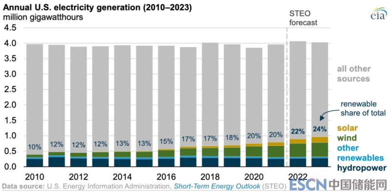 中國儲能網(wǎng)訊:據(jù)美國能源信息署的數(shù)據(jù),2020年、2021年美國水力發(fā)電、風(fēng)能和太陽能等可再生能源發(fā)電量占總發(fā)電量的20%。預(yù)計(jì)隨著風(fēng)能和太陽能的更多發(fā)電容量上線加上煤、核電的退役,這一份額將在2022年增加到22%,到2023年將增加到24%。