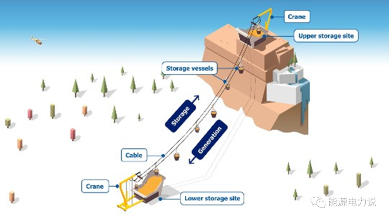 MGES由陡峭山坡、起重機(jī)、儲(chǔ)存容器(可以裝砂石或水)、電纜等組成。儲(chǔ)電時(shí),利用余電驅(qū)動(dòng)發(fā)動(dòng)機(jī)將裝滿(mǎn)沙石的纜車(chē)從山坡底部移動(dòng)到頂部,電能轉(zhuǎn)化為勢(shì)能。發(fā)電時(shí),將纜車(chē)從山坡頂部下降到底部,勢(shì)能轉(zhuǎn)化為電能。