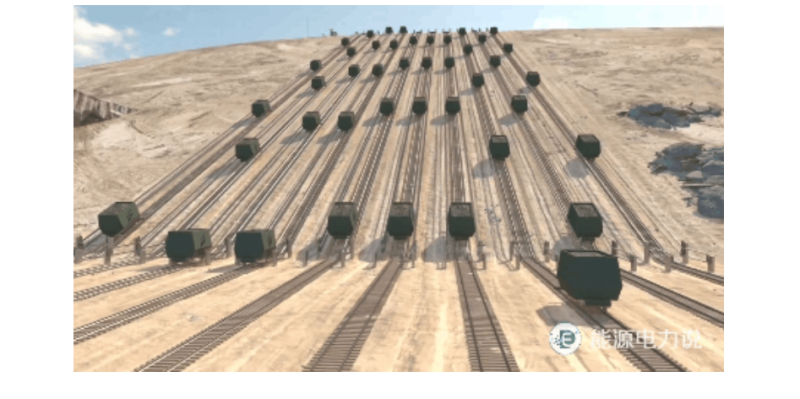 ARES公司建造了一條6英里長(zhǎng)的上坡軌道,配有重裝機(jī)車(chē),機(jī)車(chē)是實(shí)心機(jī)混凝土,每輛重達(dá)300噸,最高時(shí)速為16英里。儲(chǔ)電時(shí),利用余電將推動(dòng)高效電機(jī)將機(jī)車(chē)推至坡頂“車(chē)站”,電能儲(chǔ)存為重力勢(shì)能;發(fā)電時(shí),釋放機(jī)車(chē)下坡,重力勢(shì)能轉(zhuǎn)化為電能,開(kāi)始發(fā)電。