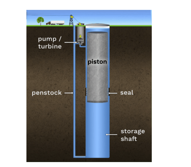 活塞式儲(chǔ)能,可以看做一個(gè)“水電池”,按采礦業(yè)的標(biāo)準(zhǔn)技術(shù)挖出豎井,在豎井中建造一個(gè)由加固巖石制成的活塞,在豎井中添加水并密封,形成一個(gè)閉環(huán)系統(tǒng)。當(dāng)電力富裕時(shí),由水泵水輪機(jī)抽水加壓,提升活塞,存儲(chǔ)能量;發(fā)電時(shí),活塞下落,其勢(shì)能傳遞給水流,由水泵水輪機(jī)轉(zhuǎn)換為機(jī)械能帶動(dòng)發(fā)電機(jī)發(fā)電。