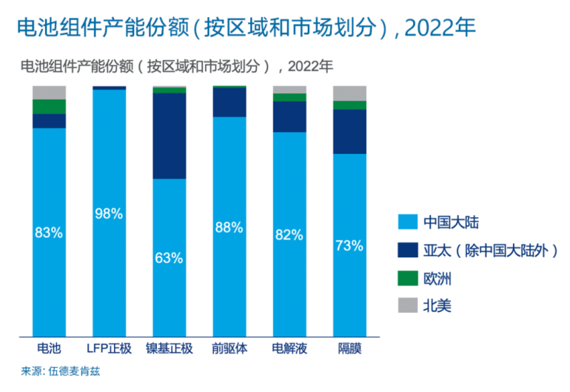 中國在電池組件的生產(chǎn)中占主導(dǎo)地位,在每個環(huán)節(jié)都至少占60%的全球市場份額。目前,鎳鈷錳三元鋰電池供應(yīng)仍占電動車市場的46%和儲能系統(tǒng)市場的55%。2022年,磷酸鐵鋰(LFP)電池的市場份額有望從2021年的25%增加到27%。在未來十年中,所有的電池組件產(chǎn)能都將有強勁的增長,尤其是到2030年,電解液的增長將達到4.5倍。
