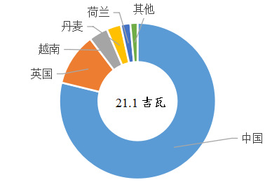 圖1 截至2021年底各國海上風電累計裝機占比情況