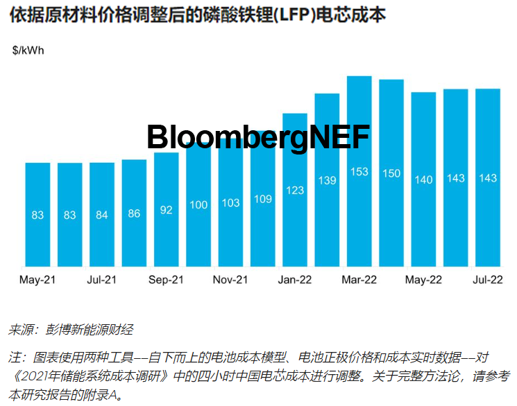 儲能系統(tǒng)所有部分的成本均已增加。由于主要原材料碳酸鋰的供應(yīng)受限,電芯——最昂貴的部分——價格所受影響最大。原材料的歷史高價已經(jīng)導(dǎo)致磷酸鐵鋰電芯價格相對2021年5月水平增長84%,在2022年3月達(dá)到峰值153美元/kWh。彭博新能源財經(jīng)預(yù)期,在2022年余下的時間內(nèi),鋰市場將持續(xù)緊張,價格將保持高位。