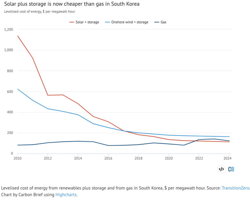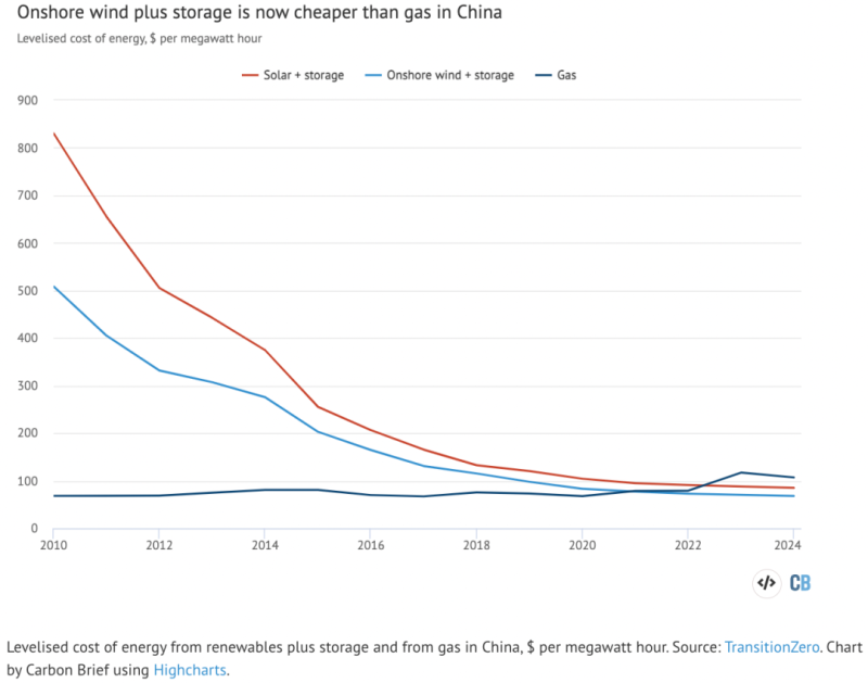分析表明,在韓國,太陽能加儲能的LCOE目前為120美元/兆瓦時,而天然氣的LCOE為134美元/兆瓦時。對于中國來說,TransitionZero分析表明,目前有儲能的陸上風(fēng)電成本為73美元/兆瓦時,而天然氣發(fā)電為79美元/兆瓦時。其數(shù)據(jù)表明,到明年帶儲能的太陽能也將比天然氣發(fā)電便宜。