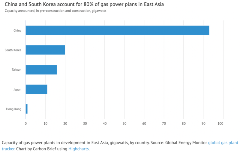 中國儲能網(wǎng)訊:據(jù)CarbonBrief網(wǎng)站發(fā)表署名Warda Ajaz的文章,東亞地區(qū)目前141吉瓦計(jì)劃中的天然氣發(fā)電產(chǎn)能中的絕大多數(shù)位于兩個國家,即中國(93吉瓦)和韓國(20吉瓦)。與此同時,兩國都承諾到本世紀(jì)中葉實(shí)現(xiàn)凈零排放,韓國的目標(biāo)是2050年,中國的目標(biāo)是到2060年實(shí)現(xiàn)“碳中和”。