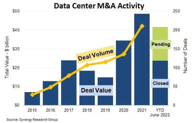 中國(guó)儲(chǔ)能網(wǎng)訊:Synergy Research Group 的新數(shù)據(jù)顯示,今年前6個(gè)月完成了87筆以數(shù)據(jù)中心為導(dǎo)向的并購(gòu)交易,總價(jià)值為240億美元,另外還有180億美元的未決交易已達(dá)成一致,但尚未正式關(guān)閉,其中大部分預(yù)計(jì)將在年底前關(guān)閉。加上幾乎沒有提前公布的常規(guī)交易,2022年的并購(gòu)活動(dòng)將達(dá)到去年的創(chuàng)紀(jì)錄水平。