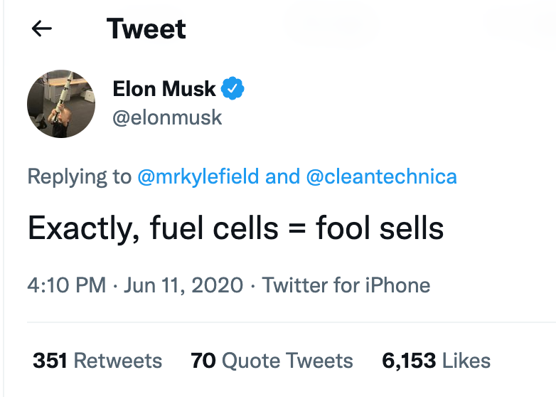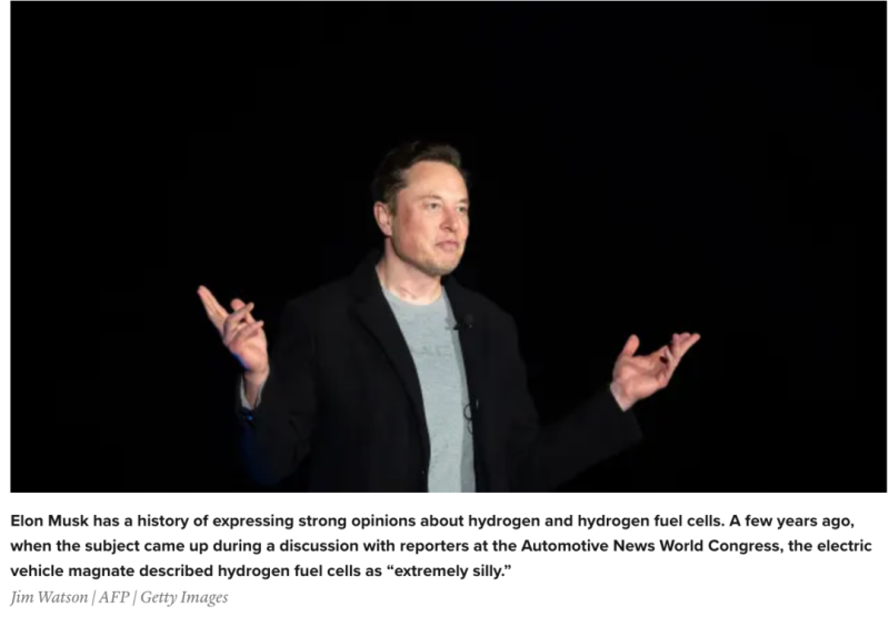 馬斯克有對氫氣和氫燃料電池發(fā)表強烈意見的歷史。幾年前,當(dāng)這個問題在汽車新聞世界大會上與記者討論時,這位電動汽車巨頭將氫燃料電池描述為“非常愚蠢”。2020年6月,他在推特上發(fā)布了“燃料電池=傻瓜銷售”,并在當(dāng)年7月補充說:“氫的‘傻瓜出售’毫無意義?!?