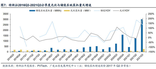 而統(tǒng)計(jì)數(shù)據(jù)一定程度上也佐證了這一發(fā)展方向。2015-2020年,特斯拉發(fā)電儲(chǔ)能業(yè)務(wù)收入復(fù)合增速達(dá)82.09%。今年Q1-Q3,特斯拉儲(chǔ)能裝機(jī)規(guī)模達(dá)4.73GWh,同比增長(zhǎng)230.64%;光伏裝機(jī)量達(dá)437MW,同比增長(zhǎng)267.23%,其中,Q3兩項(xiàng)裝機(jī)規(guī)模均創(chuàng)單季度新高。