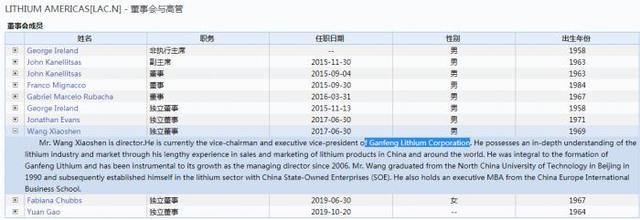LAC資料顯示,目前公司董事會(huì)由9人構(gòu)成,董事4人,獨(dú)立董事5人。其中,獨(dú)立董事包括Wang Xiaoshen(王曉申),此人為贛鋒鋰業(yè)現(xiàn)任董事、副董事長(zhǎng)。