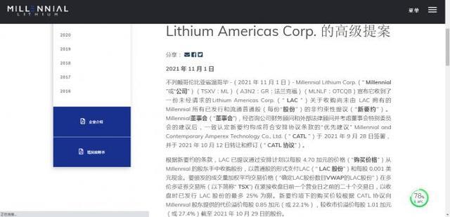 11月2日,Millennial Lithium Corp(千禧鋰業(yè))官網(wǎng)顯示,Lithium Americas Corp(LAC)已經(jīng)向該公司發(fā)出無條件要約,計(jì)劃要約收購該Millennial的所有已發(fā)行股份。