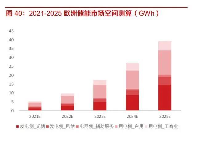 根據(jù) Solar Power Europe 的預測,歐洲光伏新增裝機量從 2020 年的 18.2GW 增長到 2025 年的 40.46GW,風電新增裝機量從 2020 年的 14.7GW 增長到 2025 年的 25.2GW.在新能源發(fā)電配置 儲能的市場,考慮到光伏發(fā)電的波動性為日內(nèi)波動,風電波動多為季節(jié)性波動,光伏配置短時儲能 的適配度更高,對光伏+儲能和風電+儲能按照不同的配置比例預測。我們假設光伏配儲能當期配 比 1%儲能時長 1.5 小時,遠期配比 12%儲能時長 3 小時來估算,風電配儲能按照配比 0.5%儲能 時長 1.5 小時,遠期配比 6%儲能時長 3 小時估算。我們預測,歐洲 2025 年新能源發(fā)電配套儲能 電站新增裝機容量為 19.1GWh,其中光伏配套 14.57GWh,風電配套 4.5GWh。