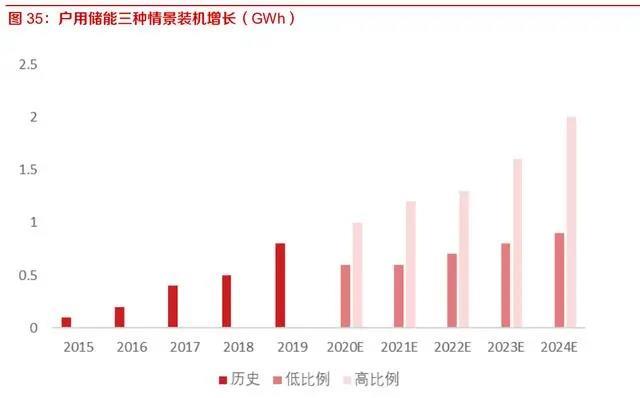 未來四年歐洲戶用儲能市場將繼續(xù)快速發(fā)展。家用儲能具備良好的經(jīng)濟性, Solar power Europe 于 2020 年預測歐洲 戶用儲能市場未來五年內(nèi)將繼續(xù)保持強勁的增長,并針對每年的新增裝機量做出三種不同的情景。目前來看,2020 年即使在疫情的影響下,也超過了低場景的預期 0.6GWh,達到了 745MWh,接 近于中場景預期。低場景下,2021 年僅增加 0.6GWh,到 2024 年 0.9GWh。中場景下,2021 年 后的戶用儲能裝機年增長率將再次超過兩位數(shù),達到 14%,到 2022 年達到 1GWh,2024 年達 1.3GWh。高場景下,儲能市場增長速度是中場景下的兩倍,預計 2021 年增長至 1.2GWh,2024 年達到 2GWh。