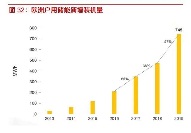 歐洲表后市場表現(xiàn)亮眼,是全球最大戶用儲能市場。根據(jù) BNEF 統(tǒng)計,2020 年歐洲新增儲能裝機 1.2GW/1.9GWh,其中戶用儲能新增 641MW,同比增長 90%,占新增市場的 52%,截至 2020 年 歐洲戶用儲能累計 1.6GW,市場規(guī)模居全球第一。工商業(yè)新增裝機 49MW,占比 4%。表后市場 中,戶用儲能占據(jù)絕對領先地位。根據(jù) Solar Power Europe 統(tǒng)計,2019 年歐洲戶用電化學儲能增 長強勁,共安裝了 96000 個系統(tǒng),總容量達 745MWh,同比增長 57%,其中德國、意大利、英國、 奧地利、瑞士五個國家就增長了歐洲戶用市場的 90%以上,僅德國一個國家就占據(jù)三分之二的市 場。