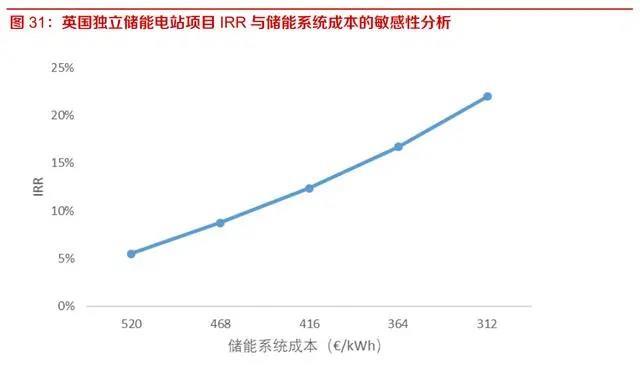 英國大型獨立儲能電站具備良好的經(jīng)濟性。根據(jù)歐盟的數(shù)據(jù),鋰電池儲能電站的成本平均為 520/kWh。下面進行英國獨立儲能電站 80MW/320MWh 的經(jīng)濟性測算,投資成本為 14201 萬英 鎊。參考論文中的數(shù)據(jù),儲能電站收入為 74.75 英鎊/MWh。儲能電站工作年限 15 年,每天充放 電 2 次,放電深度為 80%,儲能年衰減為 1%。電站維護成本前 10 年 1.5%,后 10 年 3%。電站 配備員工 8 人,人均年收入為 4 萬英鎊,每年增長 5%。資金來源自籌 50%,貸款 50%,貸款年 利率 4%,還款時間 15 年,還款方式為等額本息。貼現(xiàn)率 5%。20 年后系統(tǒng)殘值率為 5%。經(jīng)測算 得,項目 IRR 為 5.5%,投資回收期 10.15 年。