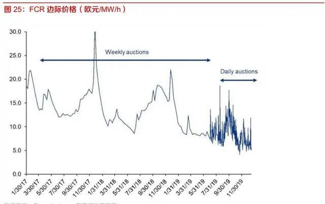 歐洲電力現(xiàn)貨交易所(EPEX)在 2018 年推出適用于西歐的六個國家的儲能環(huán)塊訂單,他們聯(lián)合 采購 3GW 的 FCR 儲能服務,其中德國 603MW,法國 561MW,荷蘭 74MW,瑞士 68MW,奧地 利 62MW,比利時 47MW,預計未來丹麥、西班牙、波蘭等國家也會相繼加入。近年來歐洲 FCR 價格出現(xiàn)下跌。Clean Horizon 研究發(fā)現(xiàn),F(xiàn)CR 價格從 2017 年的平均 18 歐元/MW/h 下降至 2020 年初的 5 歐元/MW/h,儲能在參與市場拍賣時比其他參與方更有優(yōu)勢,拉低了 FCR 價格。