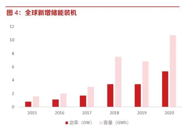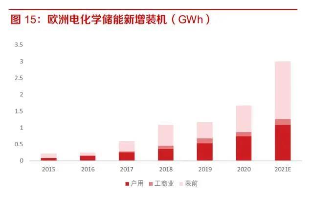 根據(jù)儲能的應用場景,可以將其分為電表前(包括發(fā)電和電網(wǎng)),與電表后(包括戶用和工商業(yè))。歐洲是當前全球最大的戶用儲能市場,根據(jù) BNEF 統(tǒng)計,2020 年歐洲戶用儲能新增裝機 641MW, 同比增長 90%,占新增市場的 52%,截至 2020 年歐洲戶用儲能累計 1.6GW。2020 年歐洲工商 業(yè)儲能新增裝機 49MW,占比 4%。表前側新增裝機 518MW,占新增市場的 42%。從具體的應用 來看, 326MW 儲能用于可再生能源并網(wǎng),175MW 儲能用于電力輔助服務。