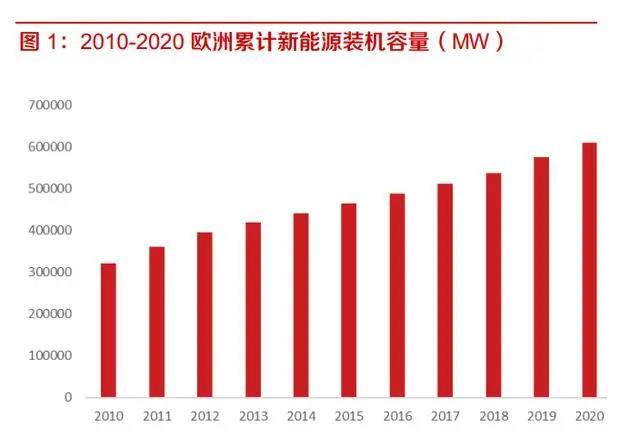 隨著燃煤的逐步退出,可再生能源成為發(fā)電主力軍。為推動可再生能源發(fā)展,各國都推出了針對可 再生能源的激勵政策,建立起以上網(wǎng)電價為主的補貼政策機制。根據(jù) IRENA 統(tǒng)計,2010 至 2020 期間,歐洲可再生能源裝機穩(wěn)步增長,截至 2020 年,歐洲累計新能源裝機容量 609.5GW。其中 德國是歐洲可再生能源裝機規(guī)模最大的國家,總裝機容量達 131.82GW,占據(jù)歐洲市場的 21.6%。德國新能源累計裝機中,陸上風電裝機 54.44GW,占比 41.3%;光伏裝機 53.78GW,占比 40.8%;海上風電 7.75GW,占比 5.9%。