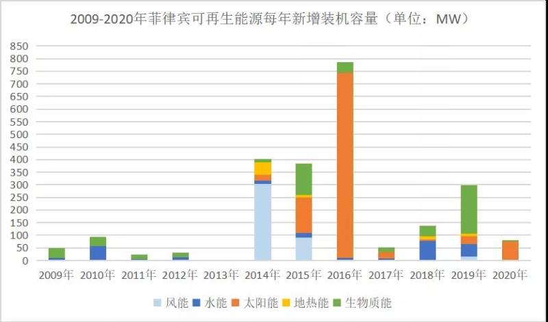 圖:2009-2020年菲律賓可再生能源每年新增裝機(jī)容量