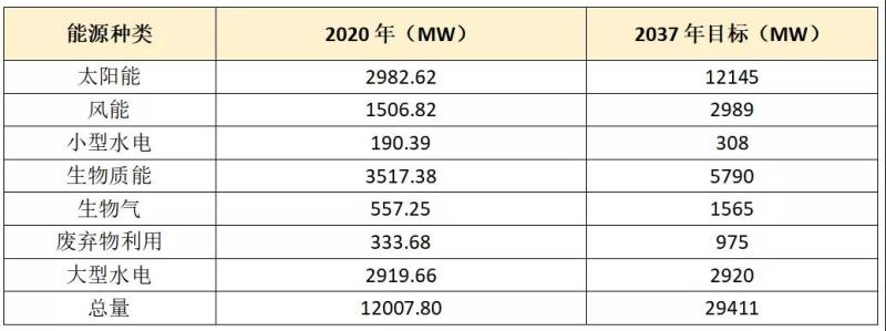 表:泰國2020年可再生能源發(fā)電裝機(jī)情況和2037年可再生能源發(fā)電裝機(jī)目標(biāo)