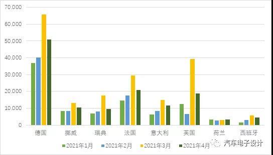 圖1 2021年4月歐洲主要國家的新能源汽車銷量概況