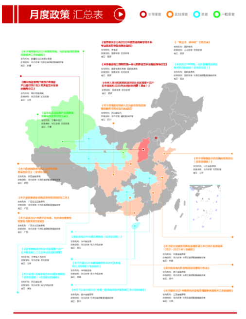 從地方來(lái)看,安徽省《關(guān)于建立安徽省可再生能源發(fā)展三年行動(dòng)計(jì)劃項(xiàng)目庫(kù)(2021-2023 年)的通知》、陜西省《關(guān)于促進(jìn)陜西省可再生能源高質(zhì)量發(fā)展的意見(jiàn)》(征求意見(jiàn)稿)、貴州省《關(guān)于下達(dá)貴州省2021年第一批風(fēng)電項(xiàng)目開(kāi)展前期工作計(jì)劃的通知》和《貴州省風(fēng)電光伏發(fā)電項(xiàng)目管理暫行辦法》、海南省《關(guān)于開(kāi)展2021年度海南省集中式光伏發(fā)電平價(jià)上網(wǎng)項(xiàng)目工作的通知》、新疆自治區(qū)《關(guān)于有序推動(dòng)2021年新增風(fēng)電、光伏發(fā)電項(xiàng)目競(jìng)爭(zhēng)優(yōu)選相關(guān)工作的通知》、江西省《關(guān)于做好2021年新增光伏發(fā)電項(xiàng)目競(jìng)爭(zhēng)優(yōu)選有關(guān)工作的通知》、廣西省《關(guān)于征求2021年度平價(jià)風(fēng)電、光伏項(xiàng)目競(jìng)爭(zhēng)性配置辦法有關(guān)意見(jiàn)的函》、甘肅省《關(guān)于加快推進(jìn)全省新能源存量項(xiàng)目建設(shè)工作》、山東省《關(guān)于開(kāi)展儲(chǔ)能示范應(yīng)用的實(shí)施意見(jiàn)(征求意見(jiàn)稿)》等都再次重申了新能源與儲(chǔ)能協(xié)同配置需求。山西省朔州市《朔州市能源局打造百億級(jí)儲(chǔ)能產(chǎn)業(yè)鏈行動(dòng)計(jì)劃》以及《甘肅省國(guó)民經(jīng)濟(jì)和社會(huì)發(fā)展第十四個(gè)五年規(guī)劃和二〇三五年遠(yuǎn)景目標(biāo)綱要》都分別從儲(chǔ)能產(chǎn)業(yè)發(fā)展和儲(chǔ)能技術(shù)應(yīng)用角度提出了宏偉目標(biāo)。隨著棄電緩解,部分地區(qū)新能源規(guī)模化建設(shè)再次啟動(dòng),這又將帶來(lái)新的消納和穩(wěn)定系統(tǒng)供應(yīng)問(wèn)題出現(xiàn),而要求新增項(xiàng)目配置儲(chǔ)能的商業(yè)化問(wèn)題也急需得到解決,這為區(qū)域新能源的高質(zhì)量發(fā)展提出了更高的要求。寧夏在印發(fā)《關(guān)于加快促進(jìn)自治區(qū)儲(chǔ)能健康有序發(fā)展的指導(dǎo)意見(jiàn)(征求意見(jiàn)稿)》之后,本月發(fā)布《自治區(qū)清潔能源產(chǎn)業(yè)高質(zhì)量發(fā)展科技支撐行動(dòng)方案》,現(xiàn)提出支持電池技術(shù)研發(fā)和系統(tǒng)集成技術(shù)應(yīng)用。