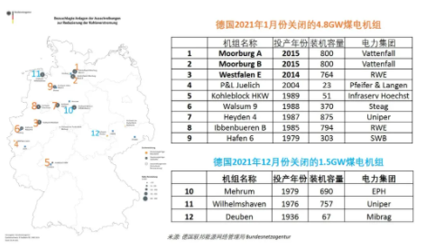 圖1 德國2021年1月份和12月份分別關(guān)閉的4.8GW和1.5GW煤電機(jī)組名單