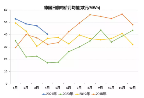圖3 2018年至2021年德國日前電價(jià)月均值(歐元/MWh)