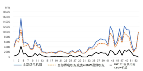 北歐電力分析機(jī)構(gòu)EnergyQuantified估算,年初關(guān)停4.8GW煤電,使得德國日前電價(jià)峰值上漲約10歐元/MWh。圖4顯示了2020年第1至53周德國煤電機(jī)組運(yùn)行容量的變化,藍(lán)色線為全部機(jī)組,黑色線則為2021年關(guān)閉的第一批4.8GW煤電機(jī)組??梢钥闯?,在2020年的高峰時(shí)段,這些機(jī)組最高供應(yīng)了4GW的電力,一半時(shí)段有2GW在運(yùn)行,只有第二三季度的運(yùn)行容量較低。也就是說,2021年初寒潮推高德國用電負(fù)荷的時(shí)段,這些被關(guān)閉的煤電機(jī)組原本可以提供2-4GW的電力,但是現(xiàn)在只能由成本更高的機(jī)組來填補(bǔ)缺口,所以使得峰值電價(jià)更高。