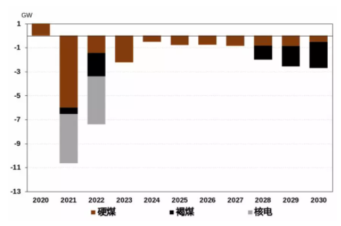 圖5 2020至2030年德國煤電和核電機(jī)組容量變化(GW)